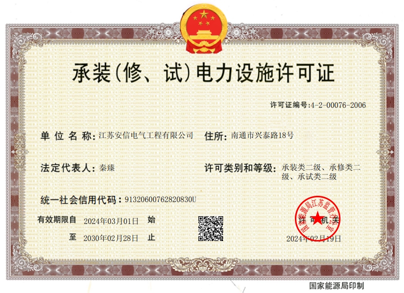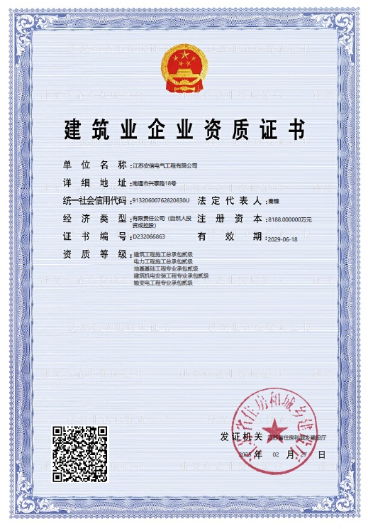 在創業之初,公司就堅持高起點的戰略思路,廣納賢才,集聚行業精英,創新發展,做優企業品牌。現已取得:承裝二級、承修二級、承試二級,電力工程施工總承包二級,輸變電工程專業承包二級,建筑工程施工總承包二級,建筑機電安裝專業承包二級,地基基礎專業承包二級資質證書,并通過了質量、環境、職業健康和安全管理體系認證,確保各項工作有序管控。